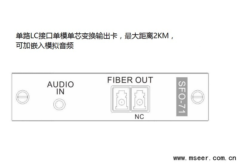 SFO-71 Fiber單通道變換輸出卡,配合SMD主機使用,采用獨立板卡設計,每塊卡支持1路Fiber輸出,LC接口單模單芯,最大距離2KM(可選配更遠距離),可加嵌入模擬音頻,支持最高1920x1080P60的數字高清圖像傳輸.