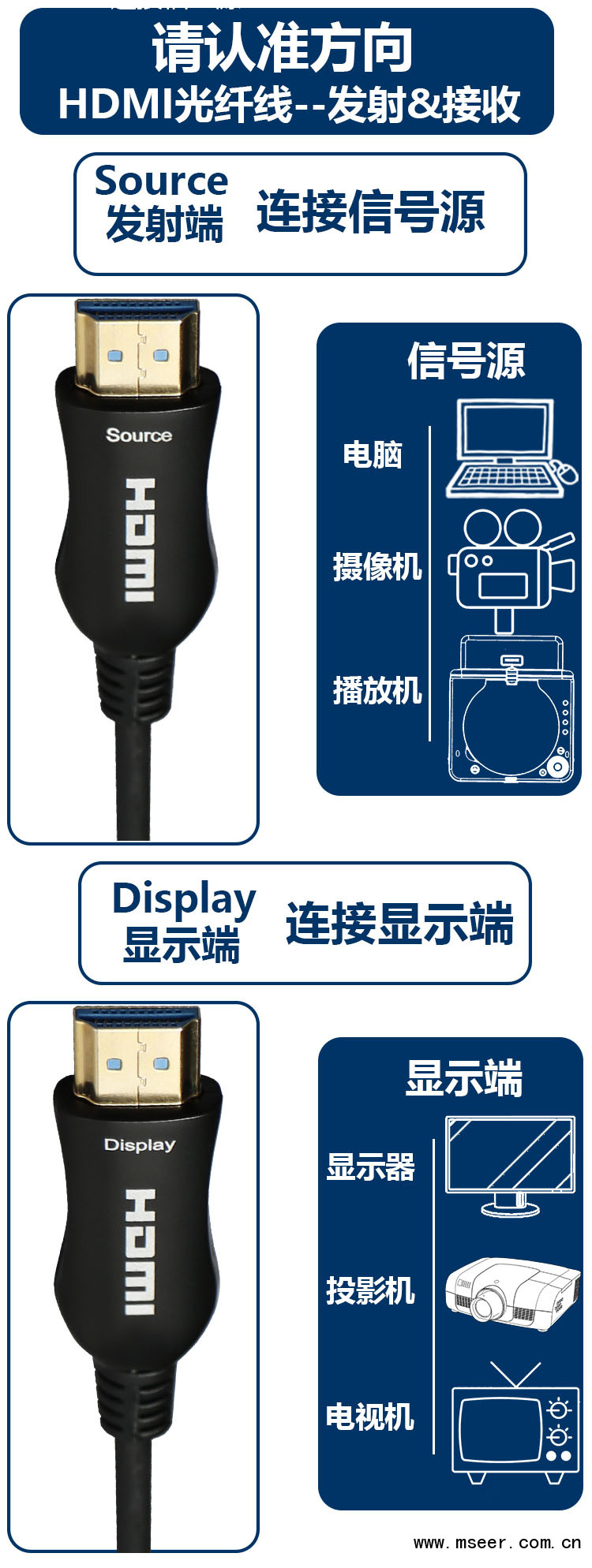 連接過程中,注意區分纜線的SOURCE 端和DISPLAY端,SOURCE 端接信號源,DISPLAY端接顯示器