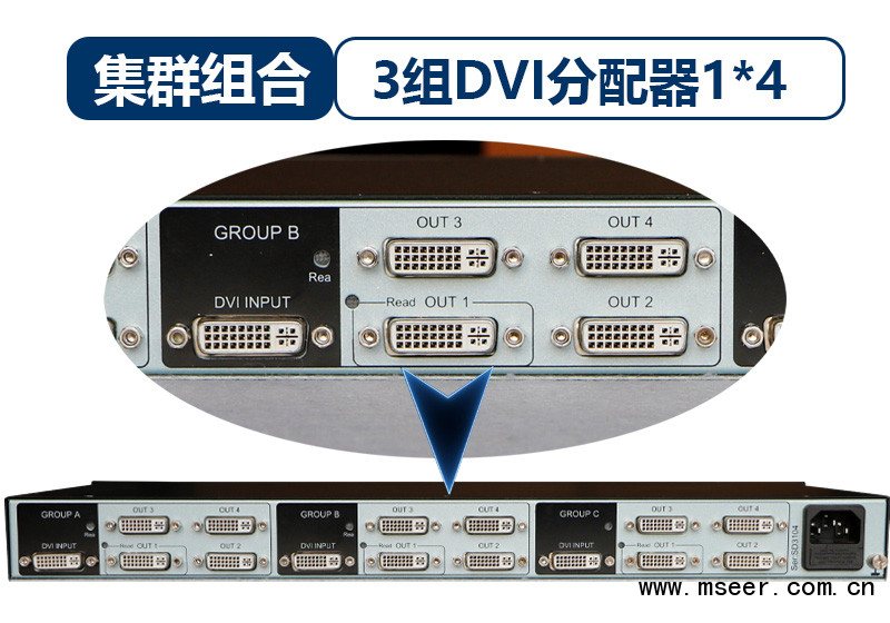 將3組DVI分配器組裝在一臺(tái)標(biāo)準(zhǔn)1U機(jī)架中??蓪?路單鏈路DVI 信號(hào)分別分配到4路數(shù)字式顯示器。支持高達(dá)1920x1200P60的DVI-D信號(hào)。