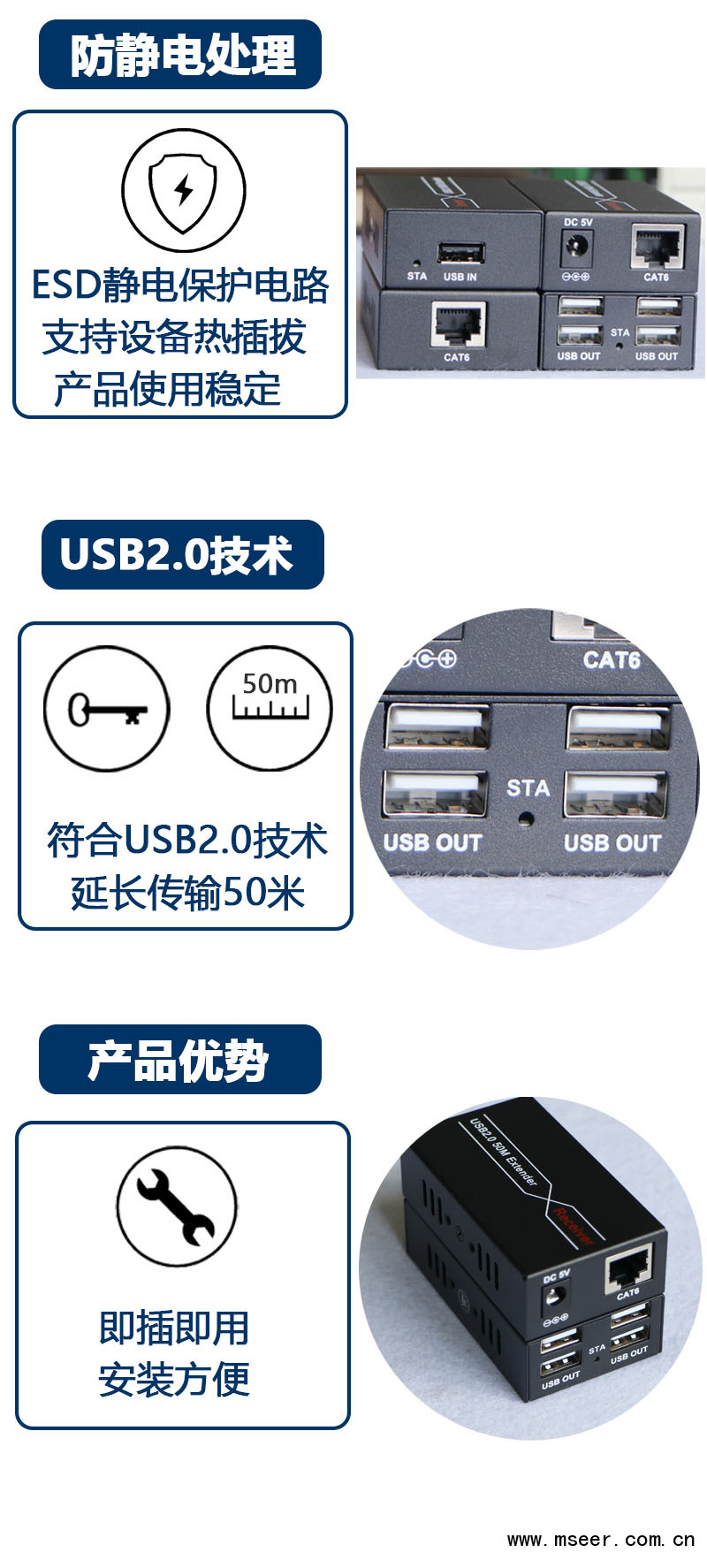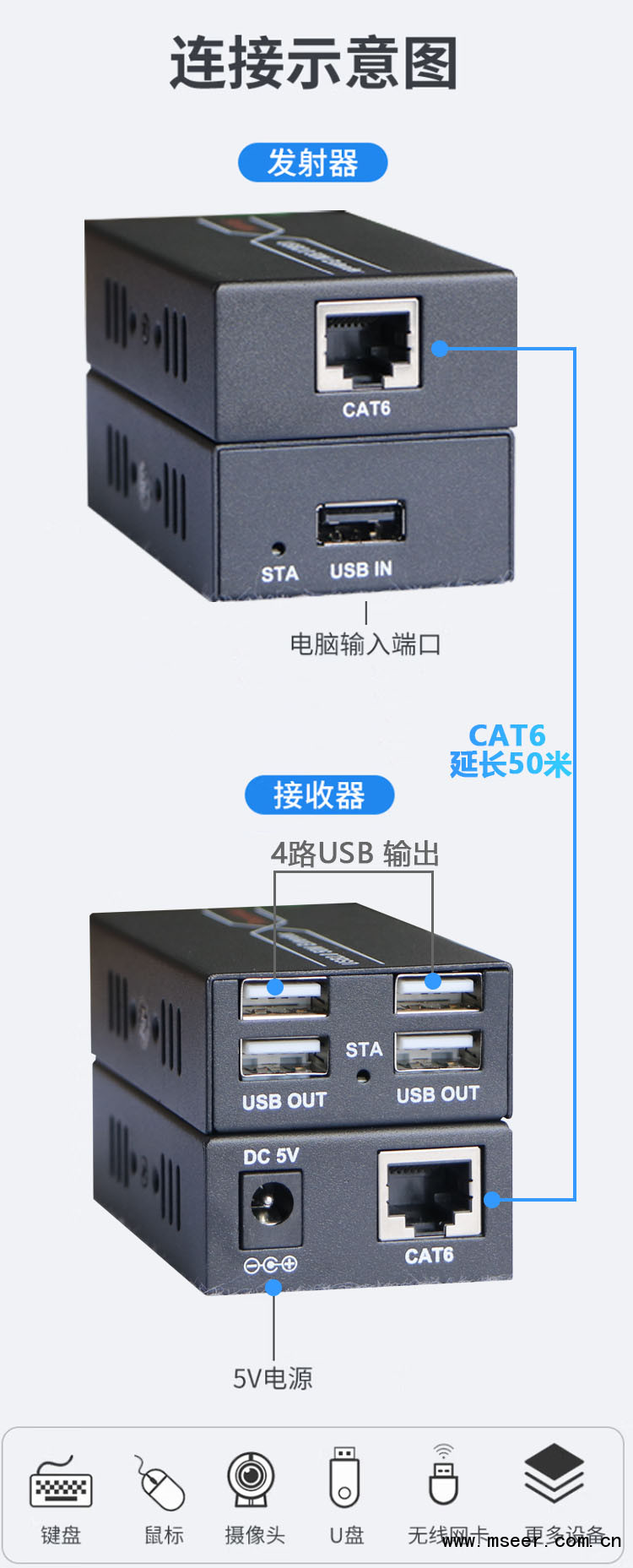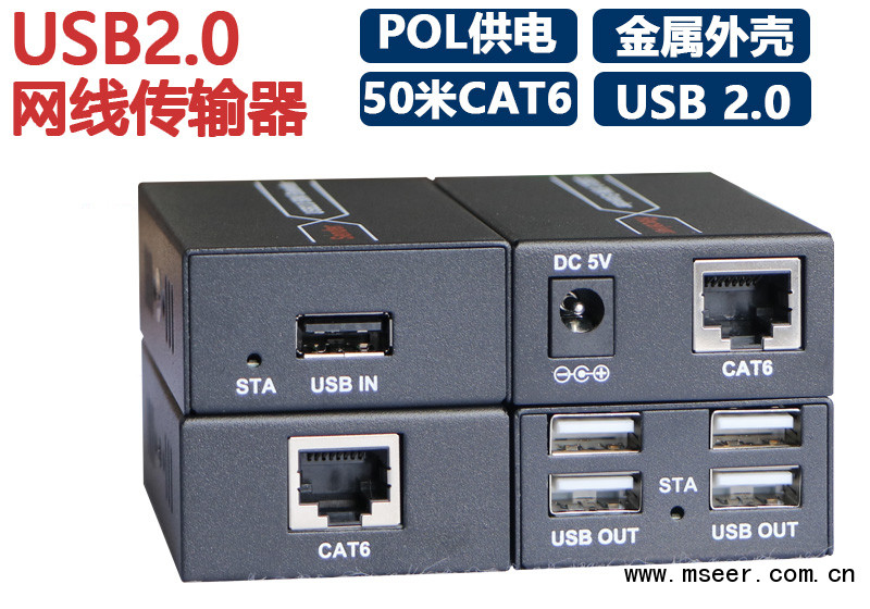 ☆支持通過單根CAT5/5e/6網線,將USB信號延長50米