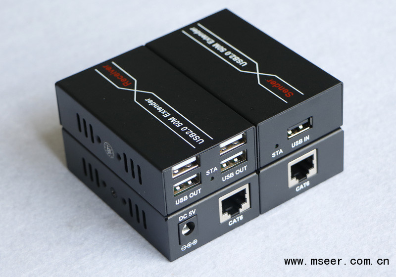 USB2.0延長器包括本地發送端(Transfer)與接收端(Receiver),可以通過單根CAT5/5e/6網線,將電腦的USB信號延長50米。傳輸速率高達480Mbps。該產品廣泛應用于電腦長距離連接打印機、掃描儀、鍵盤、鼠標 和U盤等設備。即插即用,無需驅動和安裝設置。